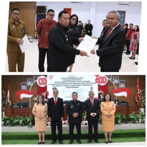 TONDANO-Bupati Minahasa Bapak. Robby Dondokambey,S.Si, MAP. Melaksanakan Pengambilan Janji Pegawai Negeri Sipil Dalam Jabatan Pimpinan Tinggi Pratama. Dr. Arody Areli Tangkere, MAP. (Asisten Perekonomian dan Pembangunan Kab. Minahasa). Edwin E. A. M. Muntu, SP. (Kepala Bapelitbangda Kab. Minahasa). Sekaligus Menyerahkan Surat Keputusan Pelaksana Tugas Kepala Dinas Pemuda dan Olaraga Kab. Minahasa Kepada :