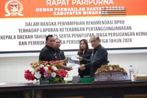 Minahasa – Bupati Minahasa Dr. Robby Dondokambey, S.Si, MAP bersama Sekretaris Daerah Kabupaten Minahasa Dr. Lynda D. Watania, MM, M.Si menghadiri Rapat Paripurna DPRD Kabupaten Minahasa dalam rangka penyampaian rekomendasi DPRD terhadap Laporan Keterangan Pertanggungjawaban (LKPJ) Kepala Daerah Tahun 2025, sekaligus penutupan masa persidangan kedua dan pembukaan masa persidangan ketiga tahun 2026, yang digelar di Ruang Sidang DPRD Kabupaten Minahasa, Kamis (30/4/2026).