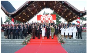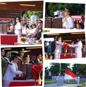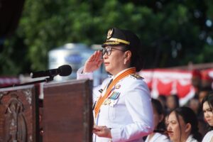 TONDANO- Wakil Bupati Minahasa, Vanda Sarundajang, SS, memimpin upacara penurunan bendera merah putih dalam rangkaian peringatan Hari Ulang Tahun (HUT) ke-80 Proklamasi Kemerdekaan Republik Indonesia di Lapangan Sam Ratulangi, Tondano, Minggu (17/8/2025).